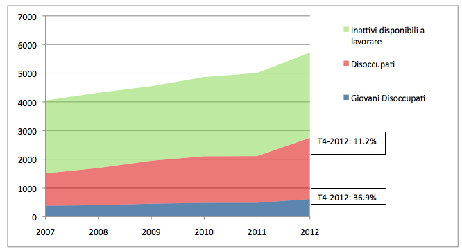 Il grafico mostra il disagio occupazionale nel nostro paese. E’ costituito dalla somma del numero di disoccupati in Italia – in blu i giovani – e i cosiddetti “ lavoratori scoraggiati”, ovvero coloro i quali non hanno cercato un lavoro nelle ultime quattro settimane e quindi non vengono classificati come “disoccupati”, ma sarebbero comunque disponibili fin da subito a lavorare (area verde nel grafico). Come si vede dal grafico, sono quasi 6 milioni le persone in condizioni di disagio occupazionale in Italia. Speriamo che il prossimo governo ne tenga conto.