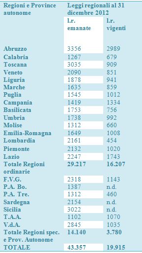 Oltre ventimila leggi regionali vigenti (non sono disponibili i dati 2012 per Sicilia, Sardegna e provincia autonoma di Bolzano) equivalgono al numero delle leggi nazionali attuali, e al contrario del livello nazionale, il trend non appare decrescente.