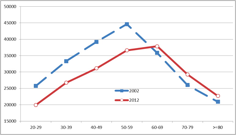 È ormai assodato che gli effetti della crisi iniziata nel 2008 sono stati molto severi per le fasce di età più giovani, che più delle altre hanno perduto il lavoro o non riescono a trovarne uno, o ricevono salari d’ingresso molto inferiori a quelli dei loro genitori. La figura 1 sembra confermare questo giudizio. È calcolata sui dati dell’indagine Banca d’Italia sui bilanci delle famiglie italiane e presenta, per classe di età della persona di riferimento, iredditi medi delle famiglie italiane nel 2002 e nel 2012. Si nota subito che il reddito medio delle fasce di età più basse è diminuito, mentre quello dei nuclei anziani è aumentato.