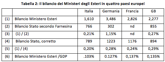 L’Annuario Statistico del Ministero degli Esteri 2013 riporta (pag. 165, Tabella 3.5) la spesa dei Ministeri degli Esteri per vari paesi, rapportati al Pil e al bilancio dello Stato. Le spese dei Ministeri degli Esteri, in miliardi di euro, sono riportate nella riga (1) della Tabella 2sottostante. Il bilancio totale dello Stato, come riportato dalla pubblicazione del Ministero, è nella riga 2. Il rapporto tra i due è nella riga 3. In effetti, il rapporto è 0,20% in Italia e 1.15% in Germania.