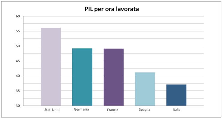 Al di là delle differenze su temi quali l’euro, le riforme del lavoro o delle pensioni, quasi tutte le parti politiche e sociali sembrano essere d’accordo sul fatto che per far uscire l’Italia dalla crisi economica sia necessario aumentare la produttività. E infatti questo è il vero problema. Il grafico riporta la misura più semplice di produttività che si possa calcolare in modo comparabile tra paesi, ovvero il prodotto interno lordo per ora lavorata. Si tratta del rapporto tra il valore complessivo della ricchezza prodotta da un paese e il numero totale di ore di lavoro effettuate nel corso dell’anno. In altre parole, tale rapporto misura il valore di quanto in media un lavoratore produce in un ora di lavoro. Il 2012 è l’anno più recente per il quale l’OCSE mette a disposizione dati di questo tipo in forma comparabile tra paesi. Come si vede, rispetto ai nostri maggiori partner economici, l’Italia ha la produttività del lavoro più bassa. In un’ora di lavoro il lavoratore medio italiano produce beni o servizi per un valore di circa 37 dollari (a prezzi 2005 e tenendo conto delle differenze nel potere d’acquisto tra paesi). Negli Stati Uniti lo stesso indicatore si attesta a oltre 56 dollari, più del 50% in più. Francia e Germania sono a pari merito intorno ai 50 dollari, sempre un consistente vantaggio di quasi un terzo sull’Italia. Ma anche la Spagna, che pure ha subito fortemente la grande recessione, ha una produttività di circa 41 dollari per ora lavorata, il 10 per cento in più di noi. È un bene quindi che ci sia consenso sul fatto che la bassa produttività sia il problema chiave dell’Italia. Le differenze riemergono in fatto di proposte per migliorare la situazione ma è necessario trovare un accordo in tempi brevi per evitare di perdere ancora terreno rispetto agli altri.