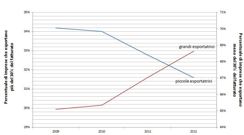 Il grafico qui sopra (1) mostra l’evoluzione temporale dal 2009 – anno di inizio della grande recessione – al 2012 – ultimo anno per il quale i dati sono disponibili – delle percentuali di imprese italiane che esportano molto (oltre il 30% del loro fatturato proviene dall’estero) e che esportano poco (meno del 30% del loro fatturato proviene dall’estero). I dati indicano che la crisi ha prodotto una forte polarizzazione delle imprese italiane. La percentuale delle imprese esportatrici è aumentata di circa 3 punti percentuali, da circa il 30% al 33%, mentre la percentuale delle non esportatrici è scesa dal 70% al 67%.