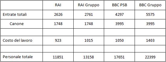 Dalla tabella risalta subito una una differenza sostanziale tra le due aziende. Il gruppo BBC è esattamente il doppio del gruppo RAI in termini di entrate totali, ma ha un costo del lavoro e un numero di dipendenti che sono superiori solo del 40 e 70 percento, rispettivamente. Percentuali simili valgono per le capigruppo.