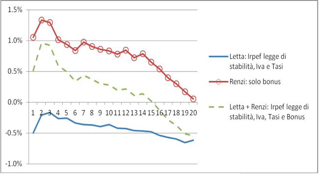 Le tre misure del Governo Letta riducono il reddito delle famiglie, perché l’aumento dell’Iva e la nuova imposta sulla casa più che compensano la maggiore detrazione Irpef. L’effetto è nel complesso molto lievemente progressivo, perché il calo in percentuale aumenta rispetto al reddito, ma si noti che proprio i più poveri subiscono una riduzione significativa, simile a quella di famiglie ben più ricche. I nuclei meno colpiti dagli interventi del Governo Letta sono quelli in povertà relativa, cioè non il 5 per cento più in basso, ma la fascia immediatamente successiva. Il bonus di 80 euro al mese inverte il segno del totale delle misure, con un saldo positivo per i tre quarti meno benestanti delle famiglie italiane.