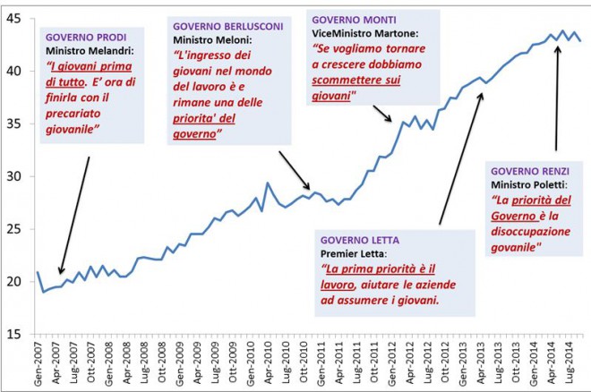 In figura 1 si vede come chiunque abbia governato si sia prodigato a rassicurare i giovani che era la volta buona e che ci sarebbe stata una svolta, senza però, alla prova dei fatti, mai incidere davvero sulla progressione verso l’alto della disoccupazione giovanile.