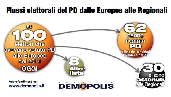 Sempre secondo l’analisi di Demopolis, il 30% di quelli che avevano votato PD alle regionali si è astenuto, mentre soltanto l’8% è passato a votare altre liste.