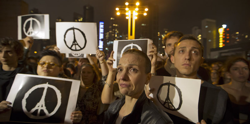 Dopo gli attentati di Parigi di venerdì notte, in cui sono rimaste uccise 127 persone, migliaia di persone in tutto il mondo hanno cercato di manifestare in qualche modo la propria solidarietà ai francesi e a chi è in qualche modo toccato dagli attentati: i più pigri di noi si sono limitati a colorare il proprio profilo Facebook con i colori della bandiera francese, altri hanno lasciato fiori, messaggi, disegni davanti alle ambasciate e ai consolati francesi della loro città, altri ancora hanno partecipato in manifestazioni e veglie. Moltissimi monumenti sono stati illuminati con i colori della bandiera francese, ci sono stati abbracci tra capi di stato e ambasciatori francesi e tra le persone comuni nelle strade di tutto il mondo: Hong Kong, Auckland, Berlino, Mosca, Roma e Milano.