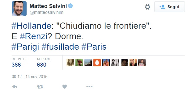«Sciacallo!». «Sciacallo!». «Sciacallo!». È l’esclamazione di centinaia di utenti che su Twitter hanno asflatato Matteo Salvini nella notte tra venerdì e sabato, mentre a Parigi si contavano le vittime del più grave attentato terroristicodella storia d’Europa. Il segretario della Lega Nord è stato letteralmente travolto dalle critiche spietate (e dagli insulti) per aver usato le stragi per fare propaganda politica. «#Hollande: ‘Chiudiamo le frontiere’. E #Renzi? Dorme», ha twittato pochi minuti dopo la mezzanotte il leader del Carroccio.